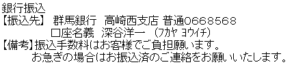 ◆お支払総額は以下のとおりです。 ●小型・中型タイプ(20cm以上、50cm以下)のだるまのご注文は税別、送料込みです。 振込金額=商品代金合計 ●大型タイプ(58cm、62cm)のだるまのご注文は税別、送料込ですが、 宅急便の取り扱いができないため下記の地域には加算分の費用がかかります。 振込金額=(商品代金合計+送料加算) ●ミニタイプ(18cm以下)の商品は税別、送料別です。 振込金額=(商品代金合計+送料) ●振込手数料はお客様ご負担願います。 ●ご入金が確認でき次第、商品の名入れ等を行ない発送致します。 ご注文をいただいてからだるまの名入れの仕上げをして発送になる都合で 申し訳ありませんが銀行振込の場合はだるまの代金は前払いでお支払い願います。 |
